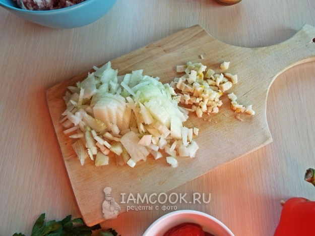 Лук и чеснок нарезать.