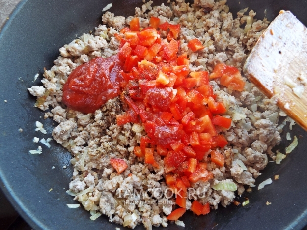 Добавить перец в фарш. Туда же отправить томатную пасту, посолить и поперчить.