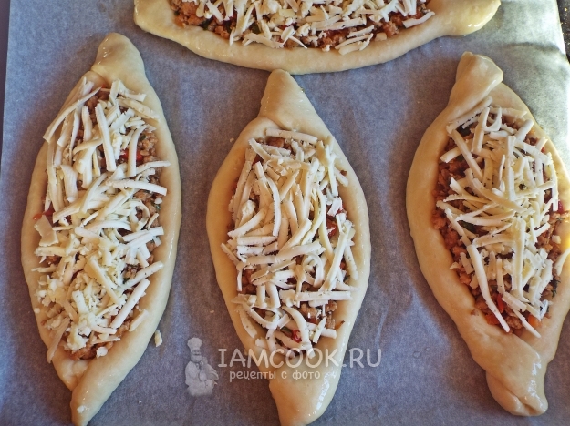 Выпекать пиде с фаршем и сыром при температуре 200 градусов 15 минут.
