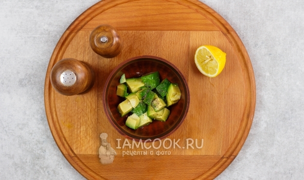 Очистите от кожуры половинку спелого авокадо и нарежьте крупными кусочками. Поместите кусочки авокадо в миску, сбрызните соком лимона, приправьте солью и молотым черным перцем по вкусу.