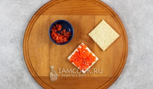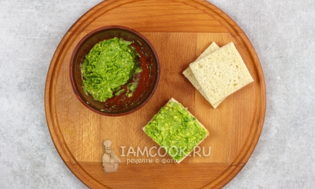 Примерно половину получившейся массы выложите на 1 кусочек хлеба.