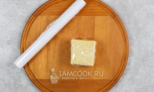 Повторите процесс с оставшейся половиной ингредиентов, сформировав таким же образом второй сэндвич. Оберните сэндвичи пищевой пленкой и поместите в холодильник на 30 минут.