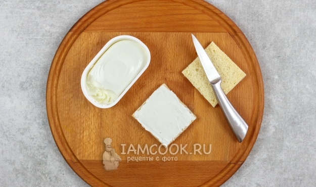 Третий кусочек хлеба смажьте сливочным сыром и выложите примерно половину нарезанной рыбы.