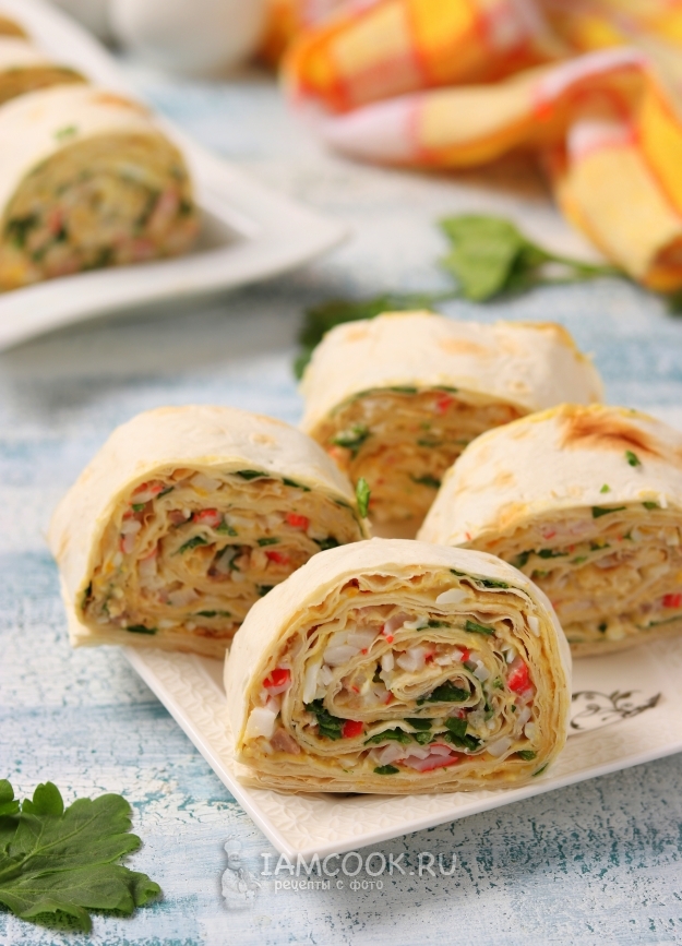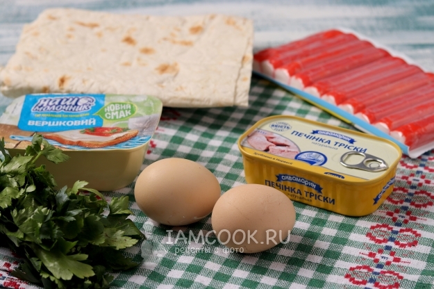 Предлагаю вашему вниманию рулет из лаваша с крабовыми палочками, яйцом и печенью трески. В отдельности с этими ингредиентами я готовила рулеты не раз, а в этот раз решила их совместить. В таком сочетании рулет получается с более насыщенным вкусом. Предложить рулет можно в качестве закуски на праздничный стол, а можно просто приготовить для завтрака или лёгкого перекуса.