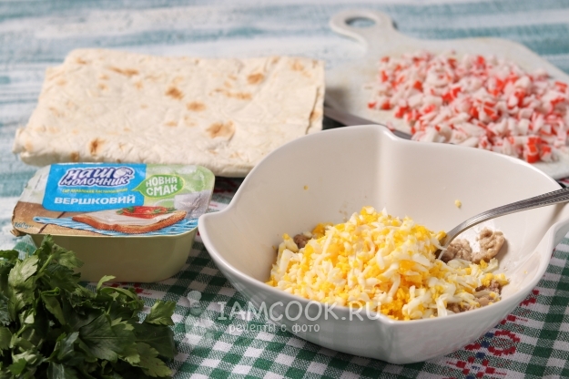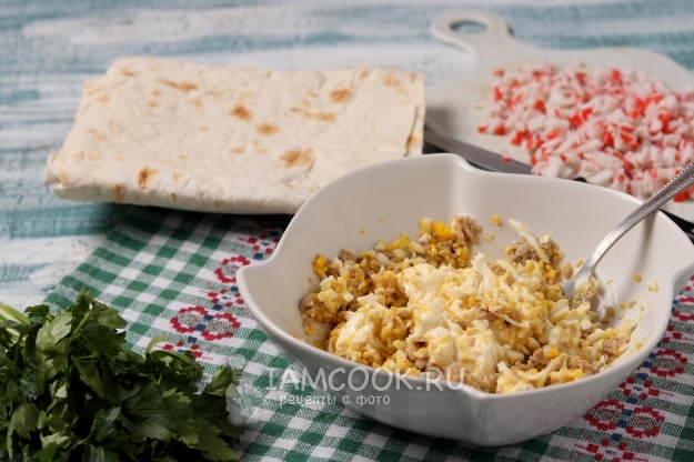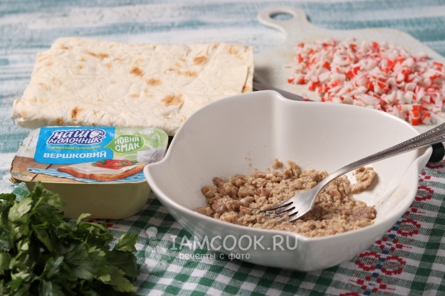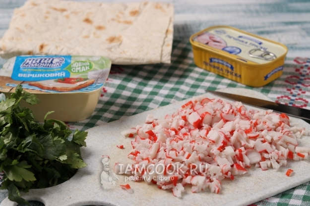 Свернуть лаваш в трубочку, завернуть в пищевую плёнку и убрать на 1 час в холодильник.