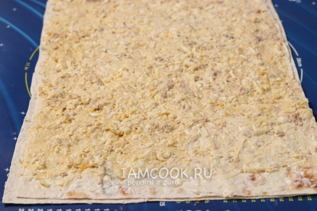 Выложить сверху второй лист лаваша, смазать его массой из печени, яиц и сыра.