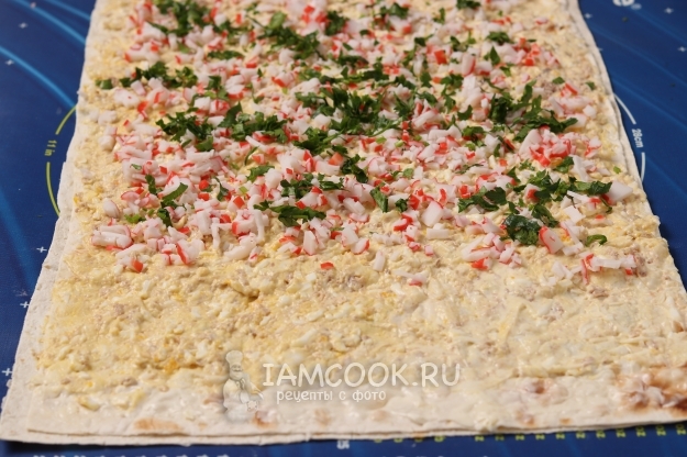 Затем разложить сверху крабовые палочки, как обычно, не до конца, а оставляя от края 12-15 см. Посыпать сверху оставшуюся петрушку.