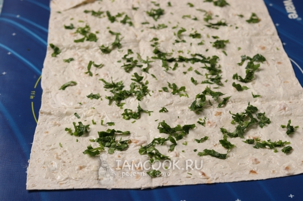 Расстелить на столе лист лаваша, смазать его плавленым сыром. Измельчить петрушку и посыпать сверху приблизительно половину.