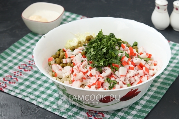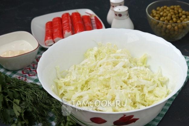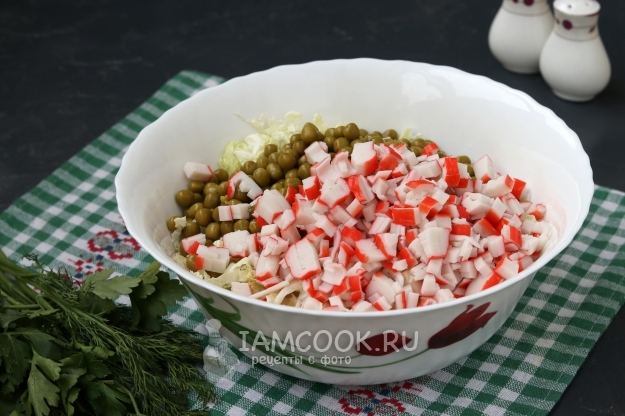Добавить крабовые палочки вместе с консервированным горошком к капусте.