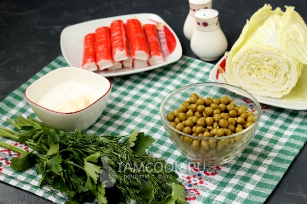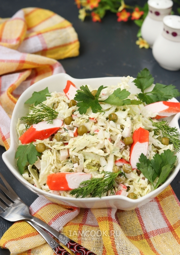 Предлагаю простой и вкусный салат с пекинской капустой, крабовыми палочками и консервированным горошком. Такой салат готовится быстро, так как ничего варить для него не нужно: быстренько всё порезал, смешал и салат сразу подаётся к столу. Впрок такой салат готовить не стоит, лучше сделать на один раз.