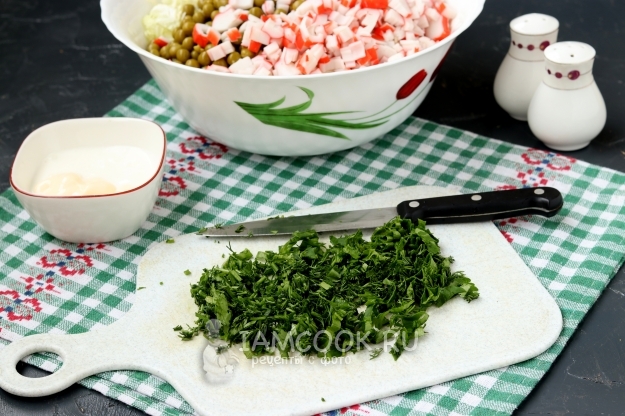 Промыть и обсушить укроп и петрушку, затем мелко нарезать.