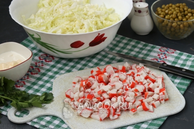 Кубиками нарезать крабовые палочки. Нарезать следует не очень мелко.