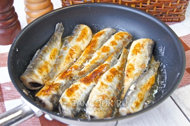 Затем разогрейте сковороду с растительным маслом, выложите рыбу, обжарьте на среднем огне с одной стороны до румяной корочки.