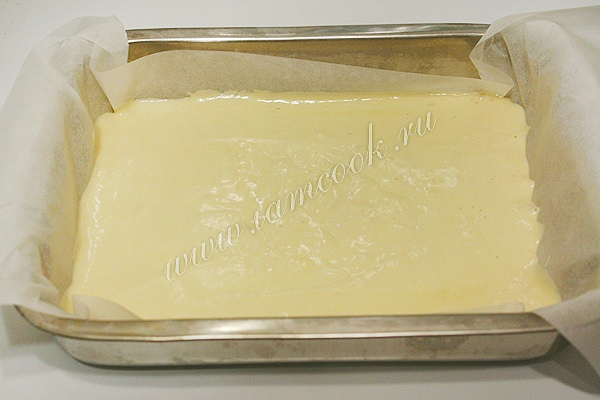 Застелите противень или форму для запекания пергаментной бумагой. Вылейте тесто в форму (У меня была форма 20 на 30, но можно взять больше, поскольку бисквит получился очень пышный). Выпекайте в духовке при 180 градусах около 15-20 минут. Духовку не открывайте. У меня была форма 20 на 30 см.