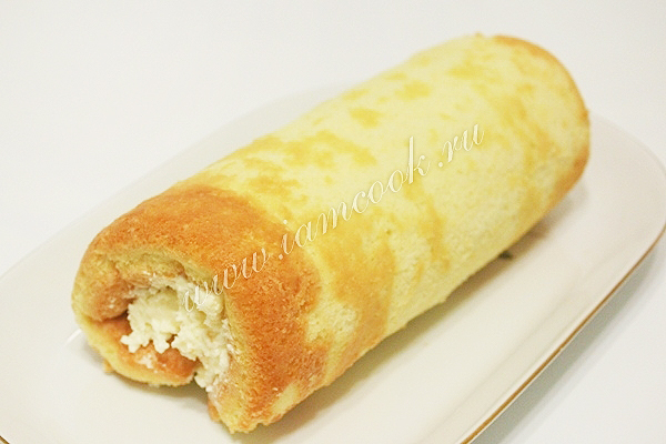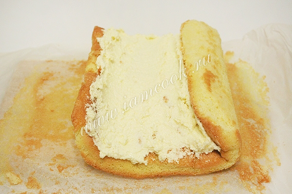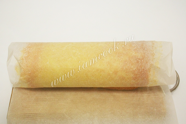 Достаньте бисквит и горячим сверните в рулет. Оставьте остывать и отложите его на 7-8 часов.
