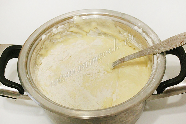 Яйца взбейте с сахаром миксером до получения густой беловатой массы. Постепенно введите в яичную смесь муку. Перемешивайте ложкой движениями снизу-вверх.