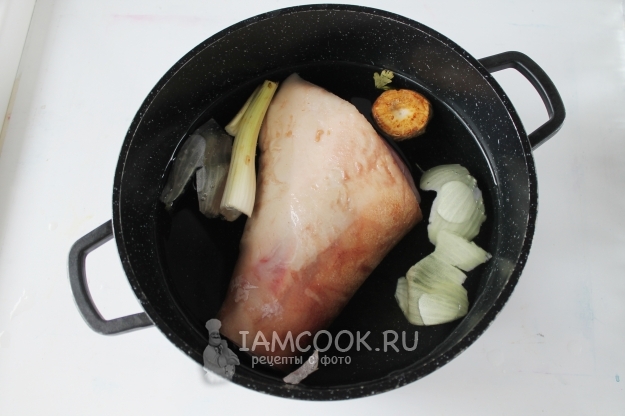 В большую кастрюлю или казан поместите хорошо промытую и выскобленную рульку, залейте водой так, чтобы она покрыла ее полностью. Добавьте для вкуса и аромата пряности и коренья. Доведите до кипения, снимите пену и убавьте огонь до минимума. Варите под крышкой часа 3-4 - до полной мягкости.