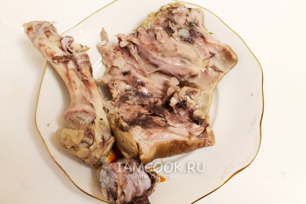 Готовую рульку достаньте из бульона, немного охладите, сделайте с одной стороны надрез и выньте кости - это получается очень легко, большая круглая кость сама отделяется, если рулька сварилась правильно. Я еще отрезала немного мяса изнутри, чтобы вошло побольше начинки.