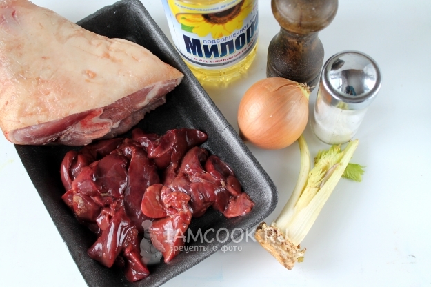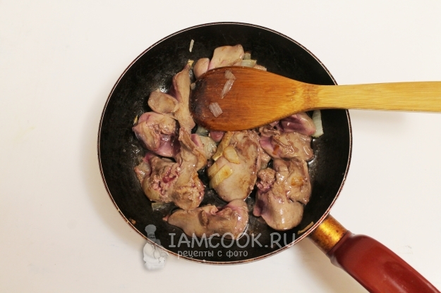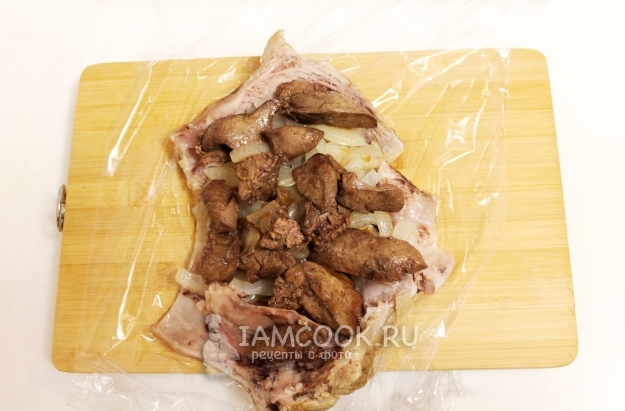 Пока рулька варится, займитесь приготовлением начинки. На подсолнечном масле обжарьте до готовности печенку с луком - не пережарьте, но и не оставьте сырой, т.к. больше тепловой обработки в рулете не будет.