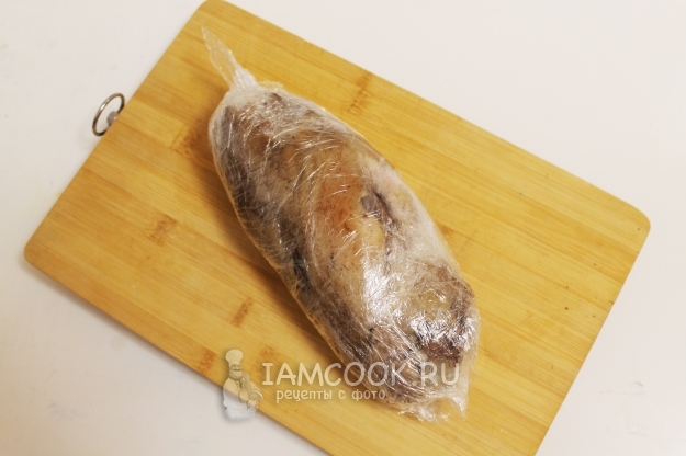 С помощью пленки туго скрутите рульку в рулет, оберните его в несколько слоев плёнки и отправьте в холодильник, водрузив сверху пресс - какую-нибудь банку с соленьями проще всего.