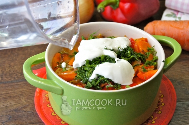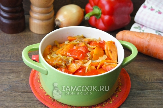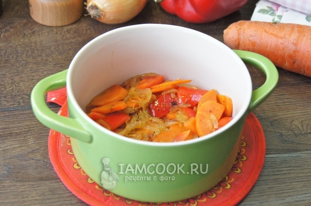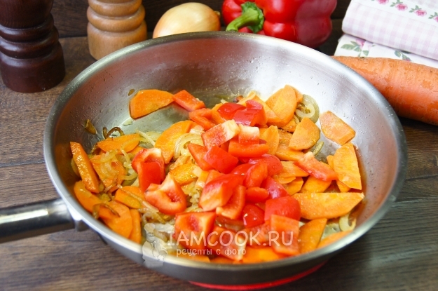 Далее очистите перец, нарежьте на средние кусочки и отправьте к обжаренным овощам, помешивая, прогрейте минут 5-7, посолите и поперчите.