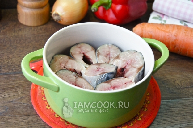 Для начала отрежьте голову у рыбы, вспорите брюшко, удалите внутренности, промойте под проточной водой и нарежьте на средние стейки.
