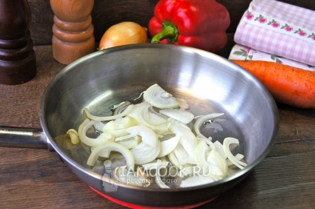 Затем очистите лук, нарежьте полукольцами и отправьте в разогретую сковороду с растительным маслом.