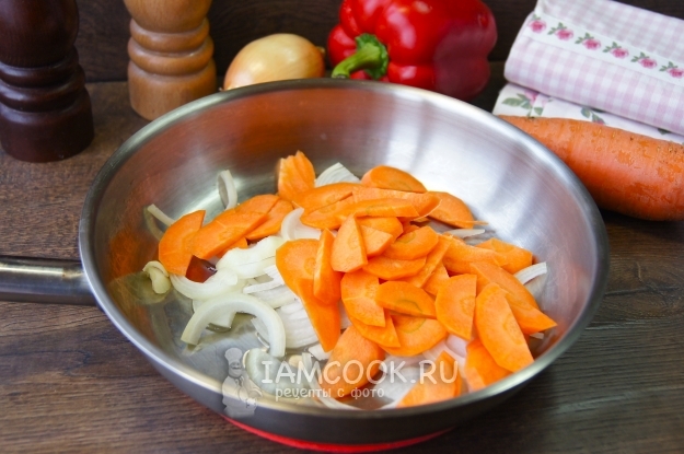 Очистите морковь, нарежьте полукружочками, отправьте к луку и обжарьте до мягкости.