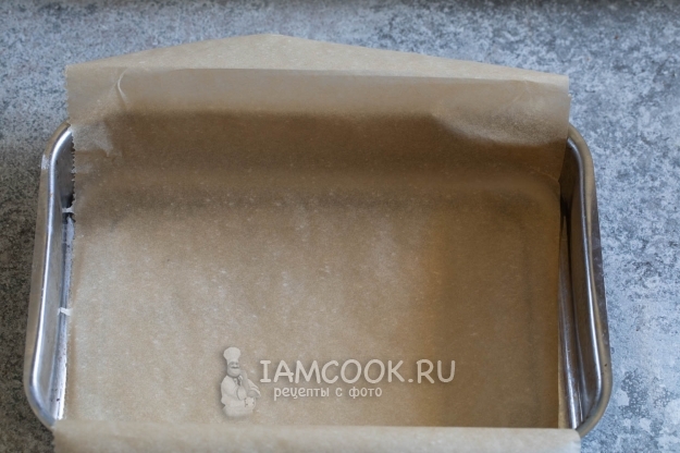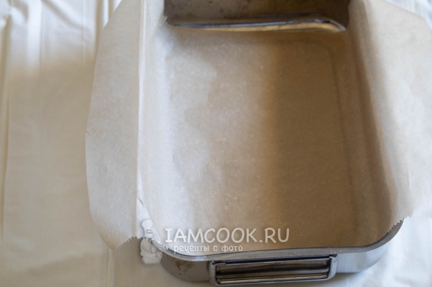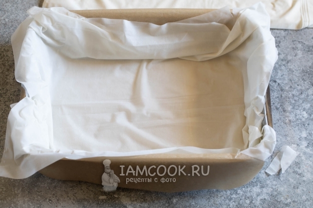 Выстилаем дно прямоугольной огнеупорной формы кондитерской бумагой так, чтобы у неё торчали над формой кончики. Это пригодится в тот момент, когда мы будем извлекать готовый кленовый пекан из формы.