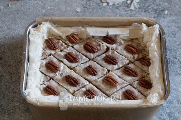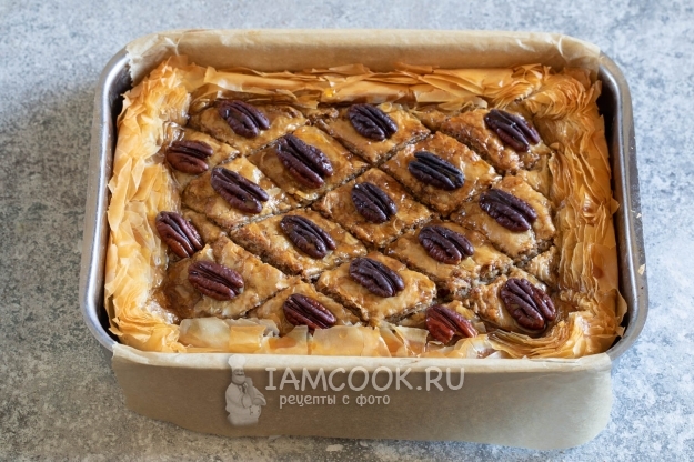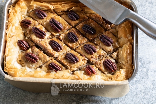 Удаляем излишки теста фило по краям. Производим насечку ромбиками, прорезая кленовый пекан глубоко, но не до конца. Каждый ромбик декорируем орехом пекан - из числа тех, которые мы отложили для этой цели в начале.