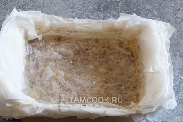 Большие отрезы фило идут вниз. Первые два слоя тесто фило просто смазываем маслом.