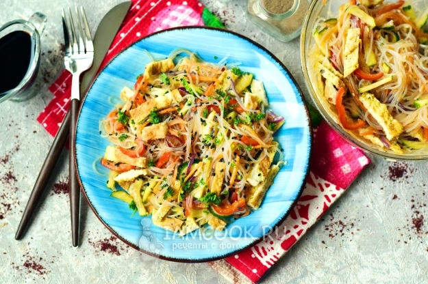 Сегодня готовим, возможно, для кого-то новое блюдо — фунчозу с яичными блинчиками. К данному сочетанию обязательно добавляются овощи для сочности, свежести и яркости. Блюдо выходит очень сытным и питательным, готовится быстро, в завершение приносит вкусовое удовольствие от употребления.