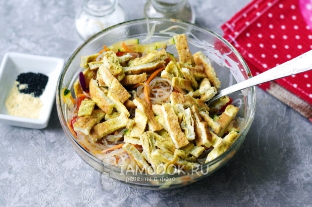 Овощи со сковороды и нарезку огурца соедините в глубокой миске с лапшой.