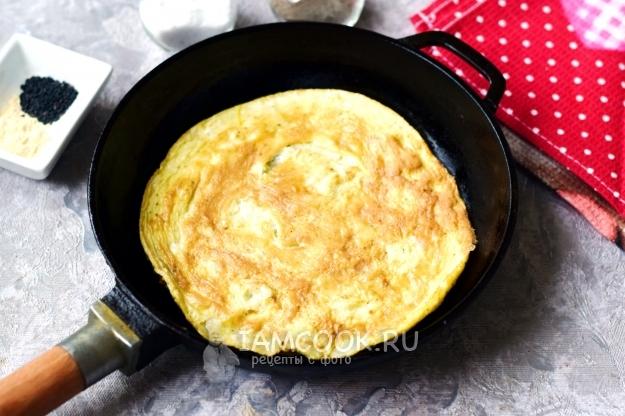 Разогрейте сковороду, смажьте ее поверхность растительным маслом в объеме 1 ст.л. Влейте яичную массу, жарьте на среднем огне. Когда одна сторона блина схватится и станет золотистого цвета, переверните его на другую, жарьте аналогично.