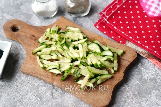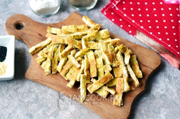 Готовый яичный блин полностью остудите, после нарежьте короткими полосками одинаковой толщины.
