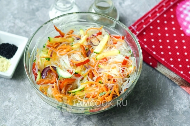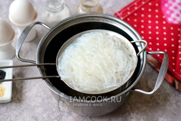 Фунчозу поместите в кастрюлю с кипящей водой. В жидкость киньте половину чайной ложки соли. Варите лапшу следующие 2 минуты, затем откиньте в дуршлаг, ополосните прохладной водой, оставьте ее в таком состоянии на время, чтобы стекла лишняя жидкость. Остывшую лапшу уложите на дощечку и порежьте ножом, чтобы длинные экземпляры стали короче.