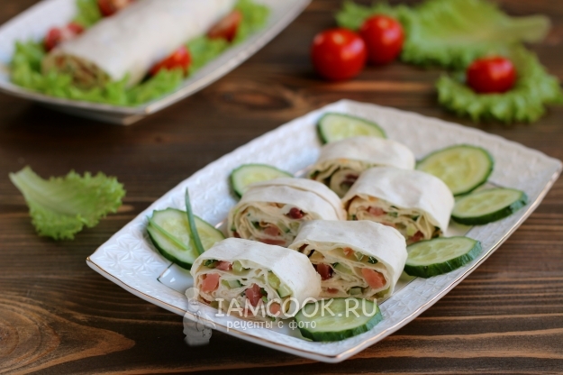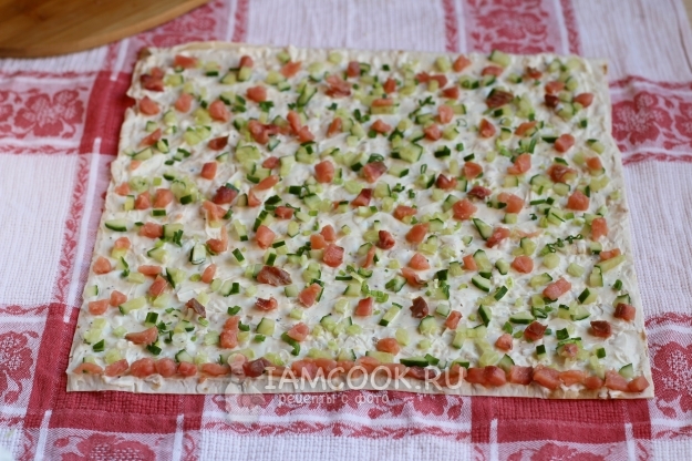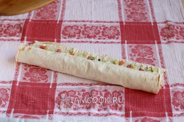 Аккуратно сворачиваем лаваш со всей начинкой в рулет.