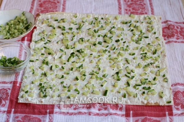 Рекомендую сразу же всё подготовить, потому что рулет из лаваша с горбушей, творожным сыром и огурцом готовит довольно быстро.