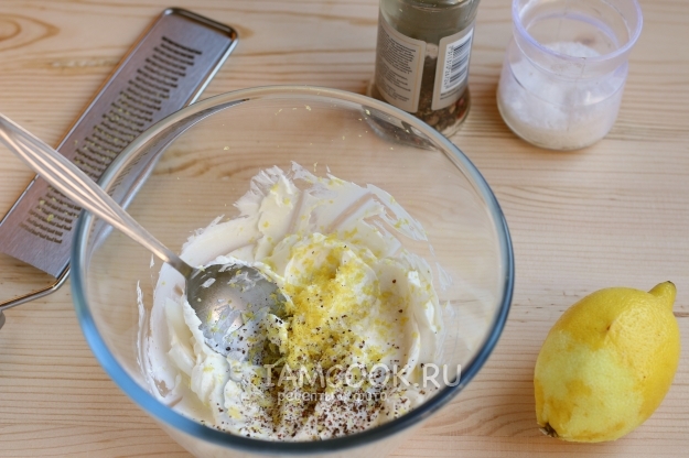 Обычно для смазывания лаваша я использую майонез, но в данном случае лучше взять сливочный сыр, так мы и калорийность закуски снизим, и с рыбой такой сыр будет отлично сочетаться. Выложим сыр в миску, натрем цедру с половины лимона, добавим молотого перца по вкусу и, если требуется, соли, не забывая, что рыбка слабосоленая.