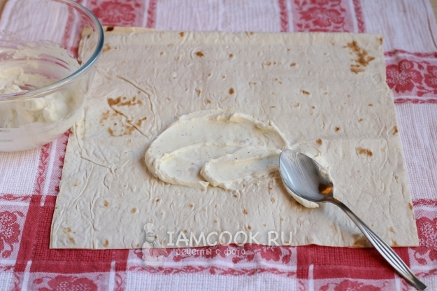 Разворачиваем лист лаваша и промазываем его творожным сыром.