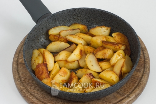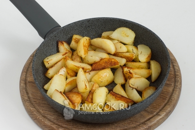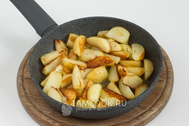 Аккуратно помешивая, обжаривайте дольки до красивой корочки.