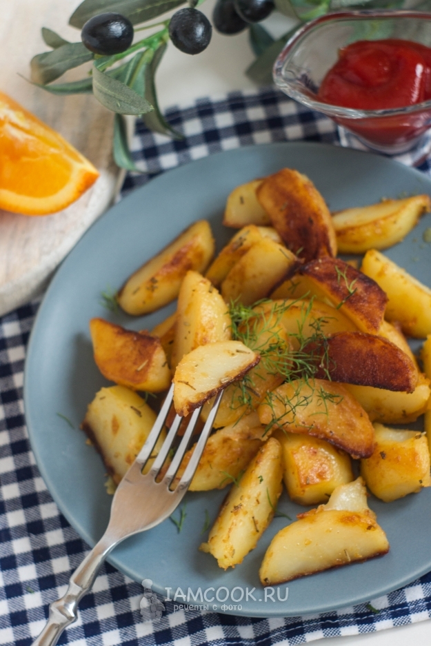 Картофель получится хорошо обжарить, если его будет немного на сковородке и дольки удобно будет переворачивать.