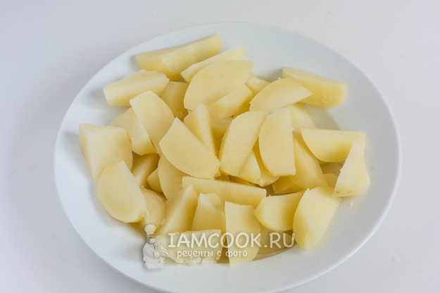 Картофель нужно взять так, чтобы клубни были одинакового размера. Дольки не должны получиться «разнокалиберными».