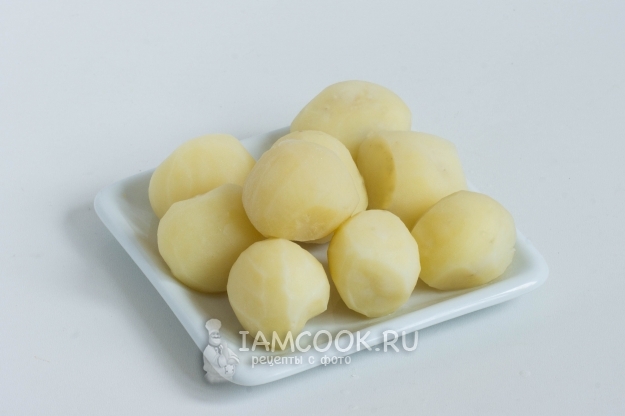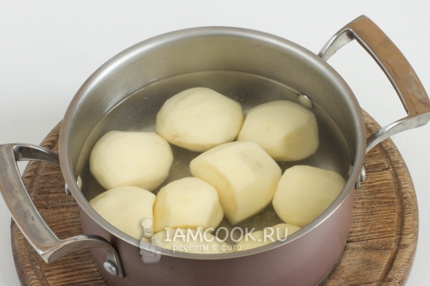 Промойте и почистите картофель, положите его в кастрюлю и залейте кипящей водой. Добавьте немного соли. Варите после закипания 10-15 минут (в зависимости от размера клубней) - до полной готовности картофеля, однако не допускайте разваривания клубней!