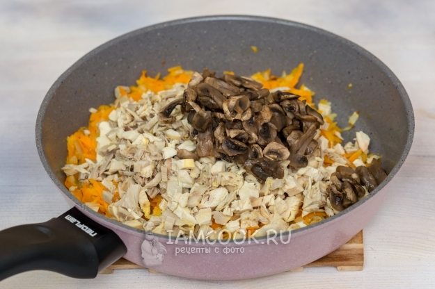 Добавьте нарезанное мелко мясо курицы и грибы.