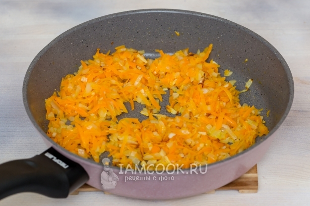 Чеснок и лук нарежьте мелко, морковь натрите на крупной терке. Обжарьте на подсолнечном масле, помешивая.