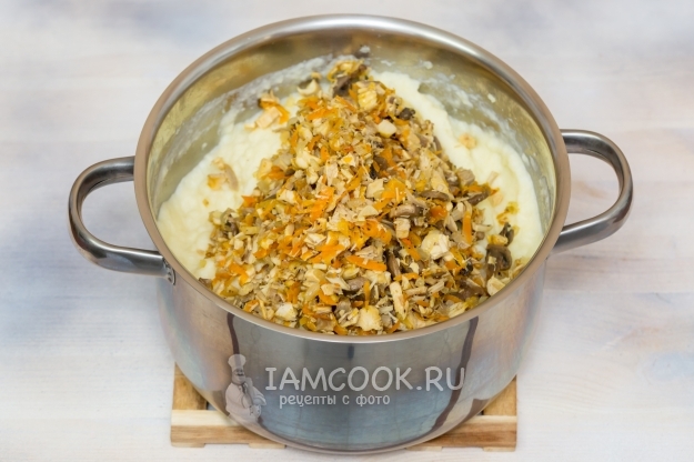 В картофельное пюре добавьте мясо, жаренное с овощами.