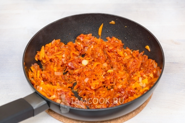 Пассеруйте овощи на масле до мягкости, затем добавьте томатную пасту. Перемешайте.