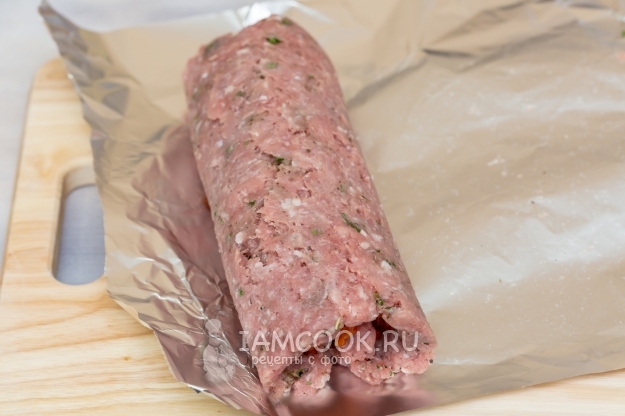Выложите фарш на фольгу. Руками распределите его, придав форму прямоугольника.