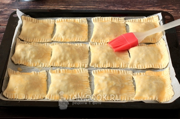 Выложить пирожки на противень, смазать яйцом и поставить в разогретую до 180 градусов духовку. Противень можно проложить пергаментом или смазать слегка маслом.